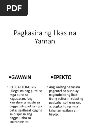 Kagubatan mabilis at patuloy na pagliit ng forest cover mula sa 17 ektarya noong 1934 ay naging 6. State of Philippine Forest2013 dumudumi ang mga katubigan dahil sa kemikal at basurang itinatapon nasisira ang kabundukan tumutukoy sa matagalan o permanenteng pagkasira ng kagubatan dulot ng ibat ibang gawain ng tao o ng mga natural kalamidad FAO 2010 Sanhi at Bunga ng mga Suliranin ng Likas na Yaman ng Asya Migration. Yaman GAWAIN EPEKTO ILLEGAL LOGGING Ang walang habas na-Illegal na pag putol sa pagputol sa puno ay mga puno sa nagdudulot ng ibat kagubatan.