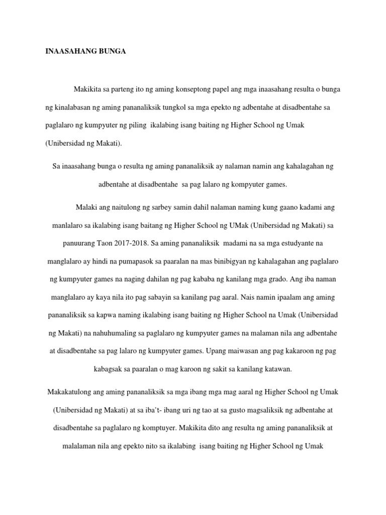 Inaasahang bunga sa konseptong papel. Villena Konseptong Papel sa pananaliksik sa Filipino 2 Paksa. Sa mga susunod namang mananaliksik maaring pagbatayan ang ginawang konseptong papel at nang sa gayon na din ay maiwasan ang mga maaring negatibong maipahayag ukol sa wika at maging pabor pa sa mga banyaga. Partido State University Kolehiyo ng Edukasyon.