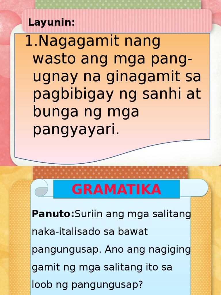 Ang mga katagan nito ay sapagkat palibhasa pagkat kasi. MagandangArawAno ang pag-uusapan natin sa araw na itoAng layunin natin sa araw na ito ay Naibibigay ang sanhi at bunga ng pangyayari sa nabasang tekstoSANHIABago ang lahat ano pala ang ibig sabihin ng SANHI at BUNGABUNGASANHIcausedahilanito ng mga pangyayariang tawag nito sa InglesHalimbawaNaligtas sa sakit ang mga Dabawenyo dahil.