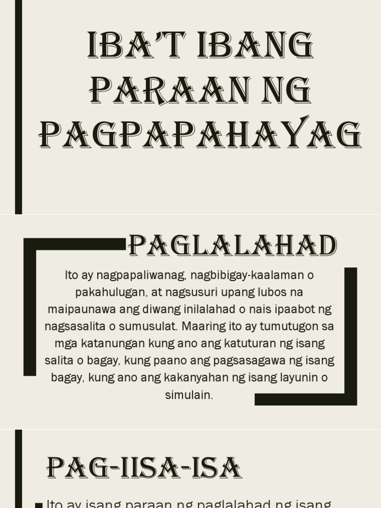 Ibat ibang paraan sa paggamit ng wika. Ibat Ibang Paraan ng Pagpapahayag Paglalahad 2. Nasa iyo ang paglahad ng maliwanag at tiyak at dapat.