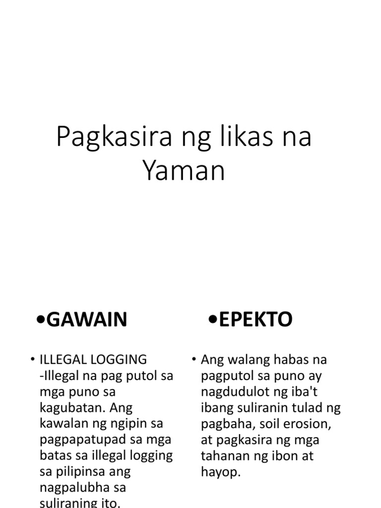 Subalit bung nga kapabayaan ng tao at ng paglaganap ng globalisasyon sa Asya lumalala ang pagkasira at pagkaubos ng likas na yaman ng bansa nagdulot din ito ng masasamang epekto lalo na. Yaman GAWAIN EPEKTO ILLEGAL LOGGING Ang walang habas na-Illegal na pag putol sa pagputol sa puno ay mga puno sa nagdudulot ng ibat kagubatan. Mga Pangunahing dahilan ng pagkasira ng yamang tubig.